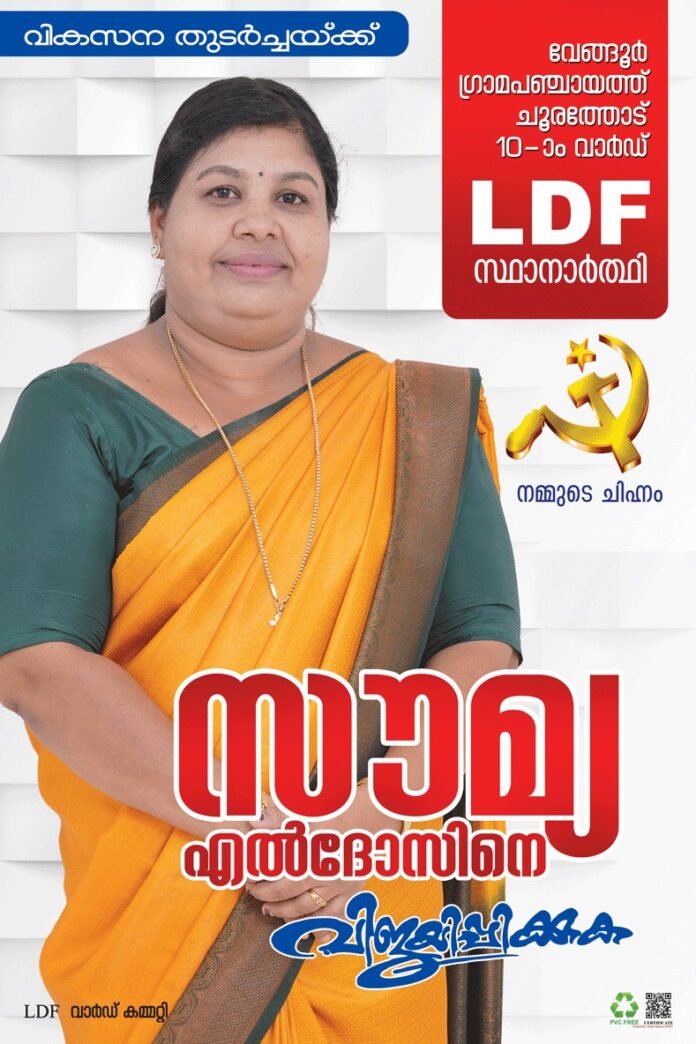 വേങ്ങൂർ : വേങ്ങൂർ ഗ്രാമ പഞ്ചായത്തിൽ കന്നി അങ്കത്തിന് ഒരുങ്ങുകയാണ് പത്താം വാർഡ് എൽ ഡി എഫ് സ്ഥാനാർത്ഥി സൗമ്യ എൽദോസ്. ആദ്യമായിട്ടാണ് മത്സരിക്കുന്നതെങ്കിലും രാഷ്ട്രീയത്തിൽ സജീവമായിരുന്ന സൗമ്യ വലിയ വിജയ പ്രതീക്ഷയിലാണ്.
