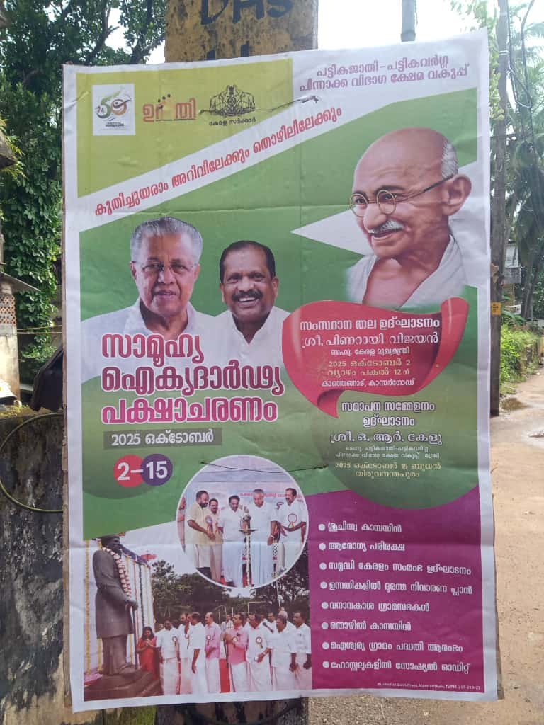 പെരുമ്പാവൂർ: സംസ്ഥാന പട്ടികജാതി വികസന വകുപ്പ് ഗാന്ധി ജയന്തി വാരാഘോഷത്തോടനുബന്ധിച്ച് വർഷം തോറും നടത്തിവരുന്ന സാമൂഹ്യ ഐക്യദാർഡ്യ പക്ഷാചരണ പ്രചാരണ വാൾ പോസ്റ്ററിൽ നിന്നുംഡോ.ബി.ആർ. അംബേദ്ക്കറുടേയും അയ്യൻകാളിയുടേയും ചിത്രങ്ങൾ ഉൾപ്പെടുത്താതിരുന്നതിൽ പട്ടികജാതി സംഘടനാ പ്രതിനിധികളുടെ യോഗം ശക്തിയായ പ്രതിക്ഷേധം രേഖപ്പെടുത്തി.മുൻ വർഷങ്ങളിൽഡോ.അംബേദ്കറുടയും ഗാന്ധിജിയുടേയും ചിത്രങ്ങൾ ഉൾപ്പെടുത്തിയിരുന്ന താ ണെ ങ്കിലും ഇപ്രാവശ്യം അംബേദ്ക്കറുടെ ചിത്രം ഒഴിവാക്കിയത് അംബേദ്ക്കറോട് കാണിച്ച അവഹേളനമാണെന്ന് യോഗം അഭിപ്രായപ്പെട്ടു.യോഗത്തിൽഡോ.അംബേദ്കർ സാംസ്ക്കാരിക വേദി സംസ്ഥാന പ്രസിഡന്റ് . ശിവൻ കദളി അദ്ധ്യക്ഷത വഹിച്ചു. കേരളാ സ്റ്റേറ്റ് ഹരിജൻ സമാജം പ്രസിഡന്റ് . വി.കെ.വേലായുധൻ, എസ്.സി / എസ്.ടി കോ-ഓർഡിനേഷൻ കമ്മിറ്റി ചെയർമാൻ എം.ഏ.കൃഷ്ണൻ കുട്ടി, എം.കെ. അംബേദ്ക്കർ, സജി.കെ.കെ,പ്രദിപ് കുട്ടപ്പൻ എന്നിവർ സംബന്ധിച്ചു.