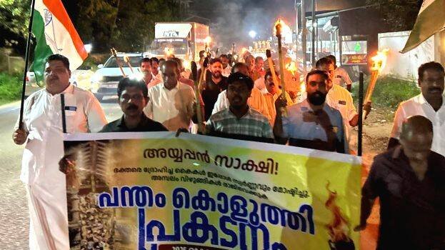 പെരുമ്പാവൂർ: ശബരിമലയിലെ സ്വർണ്ണപ്പാളി നഷ്ടപ്പെട്ട സംഭവത്തിൽ സർക്കാരിനെതിരെ പ്രതിഷേധം രേഖപ്പെടുത്തി കോൺഗ്രസ് അറക്കപ്പടി മണ്ഡലം കമ്മറ്റിയുടെ നേതൃത്വത്തിൽ പന്തം കൊളുത്തി പ്രതിഷേധ ജാഥ നടത്തി. മണ്ഡലം പ്രസിഡന്റ് അഡ്വ. അരുൺ പോൾ ജേക്കബ്, ഐ.എൻ.ടി.യു.സി സംസ്ഥാന സമിതി അംഗം കെ.എൻ സുകുമാരൻ, ബ്ലോക്ക് കോൺഗ്രസ് നേതാക്കളായ ടി.എം. കുര്യാക്കോസ്, അലി മൊയ്ദീൻ, അജിത് കടമ്പനാടൻ തുടങ്ങിയവർ നേതൃത്വം നൽകി.