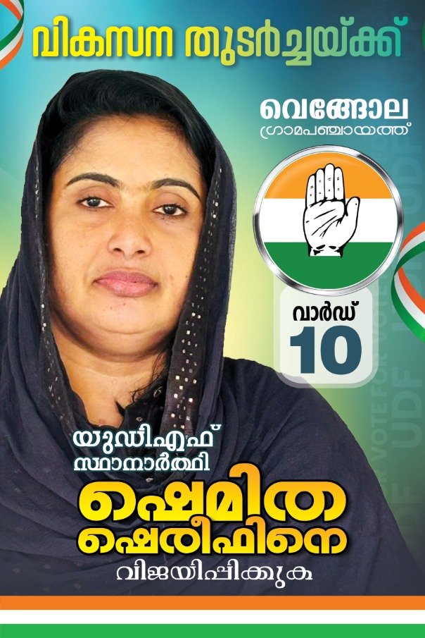 പെരുമ്പാവൂർ: വെങ്ങോല പഞ്ചായത്തിലെ 10-ാം വാർഡിൽ ഇത്തവണ യു ഡി എഫ് പോരാട്ടത്തിനിറക്കുന്നത് കഴിഞ്ഞ രണ്ടുതവണയും വാർഡിൽ വിജയക്കൊടി പാറിച്ച ഷെമിതാ ഷെരീഫിനെയാണ്. വെങ്ങോല പഞ്ചായത്തിലെ വൈസ് പ്രസിഡന്റായി ഇപ്പോൾ സേവനമനുഷ്ടിക്കുകയാണ് ഷെമിത. ഭർത്താവും മൂന്ന് കുട്ടികളും അടങ്ങുന്ന കുടുംബത്തിൽ എല്ലാവരും ഷെമിതക്ക് പിന്തുണയുമായി രംഗത്തുണ്ട്.