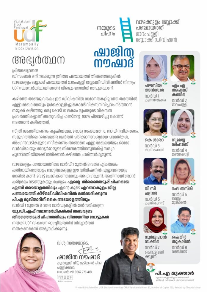 വീടുകൾ കയറിയിറങ്ങി വോട്ടഭ്യർഥന നടത്തുമ്പോൾ ഈ അഭ്യർഥന നോട്ടീസ് ഏറെ ഗുണം ചെയ്യുന്നുണ്ടന്ന് ഷാജിത നൗഷാദ് പറഞ്ഞു. താൻ പ്രതിനിധാനം ചെയ്യുന്ന ഡിവിഷനിലെ യു.ഡി.എഫിലെ ലെ എല്ലാവരും തിരഞ്ഞെടുക്കപ്പെടുകയാണങ്കിൽ അത് വികസന പ്രവർത്തനങ്ങൾക്ക് ഏറെ ഗുണകരമാവുവെന്ന് ഷാജിത പറഞ്ഞു. വനിത ലീഗ് സ്റ്റേറ്റ് വൈസ് പ്രസിഡൻ്റും ബ്ലോക്ക് പഞ്ചായത്ത് സ്റ്റാൻ്റിംഗ് കമ്മിറ്റി ചെയർമാനുമായ ഷാജിത ഡിവിഷനിലെ നിലവിലെ സിറ്റിംഗ് മെമ്പറാണ്